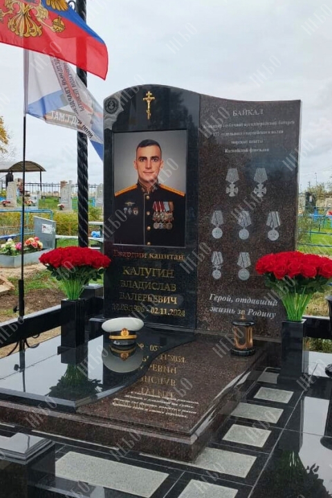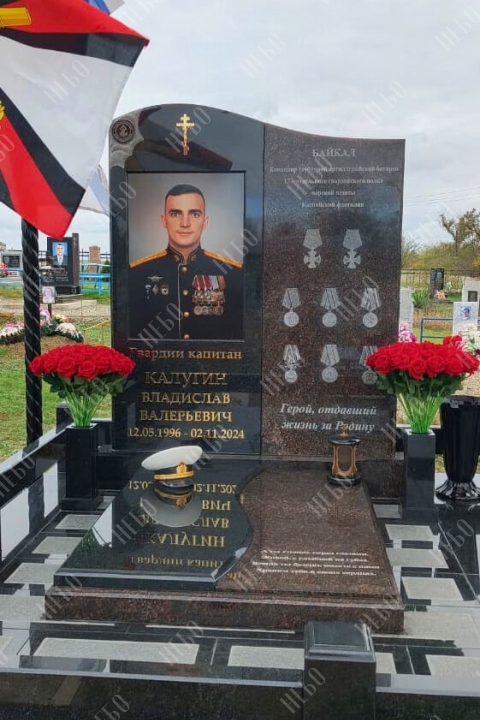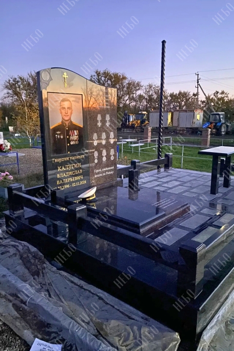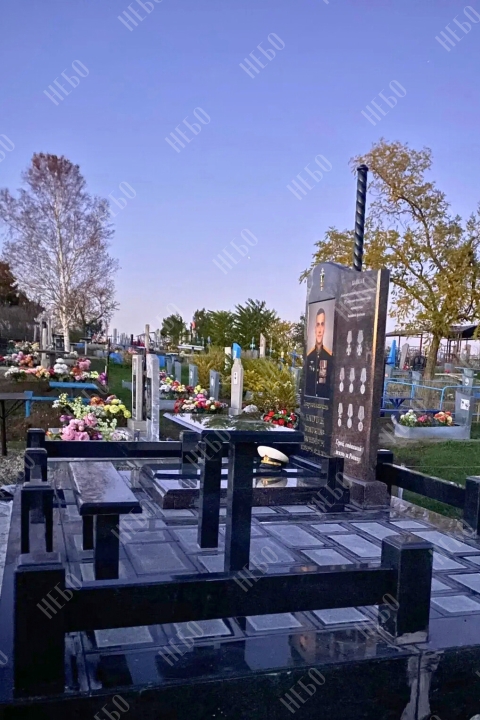 Памятник из полированного гранита двух видов: карельского и дымовского. Композицию дополняет фото из керамогранита, надпись золотого цвета, крест, фуражка от военной формы и вазы, расположенные по обеим сторонам памятника.
